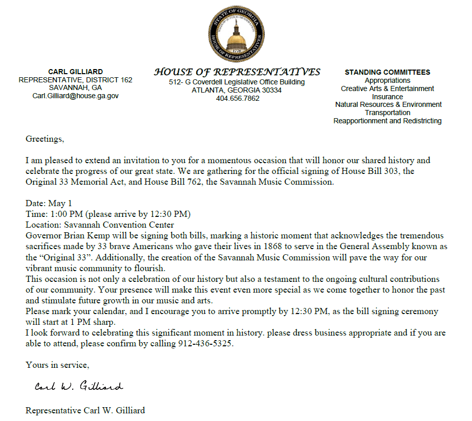 House Bill 303, The Original 33 Memorial Act Passes May 1, 2025 | Cynthia Jennings Bill Signing Today in Savannah https://www.wtoc.com/2025/03/31/hb-303-known-original-33-memorial-act-passes-ga-state-senate/ Share this: Click to share on X (Opens in new window) X Click to share on Facebook (Opens in new window) Facebook Click to print (Opens in new window) Print Click to email a link to a friend (Opens in new window) Email Click to share on Reddit (Opens in new window) Reddit Click to share on Tumblr (Opens in new window) Tumblr Click to share on Pinterest (Opens in new window) Pinterest Click to share on Pocket (Opens in new window) Pocket Like Loading...